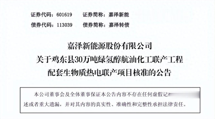 2月25日,嘉泽新能公告称,公司二级控股子公司黑龙江嘉益荣源绿色化工有限公司于日前收到了黑龙江省发改委《关于鸡东县30万吨绿氢醇航油化工联产工程配套生物质热电联产项目核准的批复》文件,核准了鸡东县30万吨绿氢醇航油化工联产工程配套生物质热电联产项目。项目具体如下: