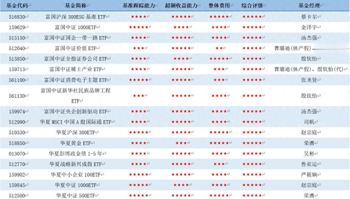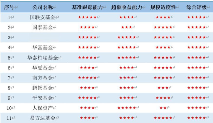 截至2025年四季度末,旗下获得五星评级的指数型基金管理公司有国泰基金、华泰柏瑞基金、华夏基金、南方基金、平安基金和易方达基金等11家基金公司。其中,国泰基金、鹏扬基金、平安基金、人保资产是新晋调入五星评级的基金公司。